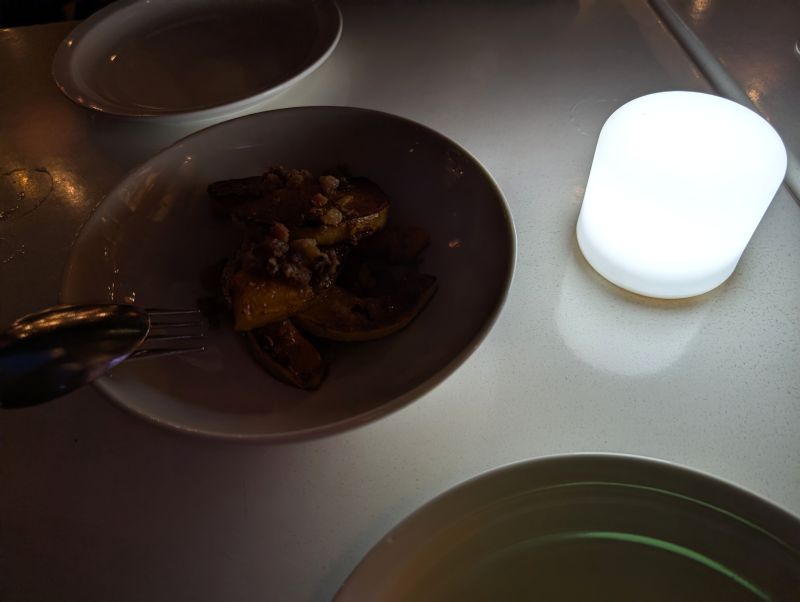 でもだんだん暗くなってきました。料理がよくみえないよ~。写真を撮るとカメラが壊れたのかと思うほどのシャッタースピード。取れた料理は美味しそうでないどころか、グロテスクでした。こうこれは事件だ。太陽って偉大。申し訳程度のテーブルライト。明るすぎても駄目だし、難しいなぁ。
