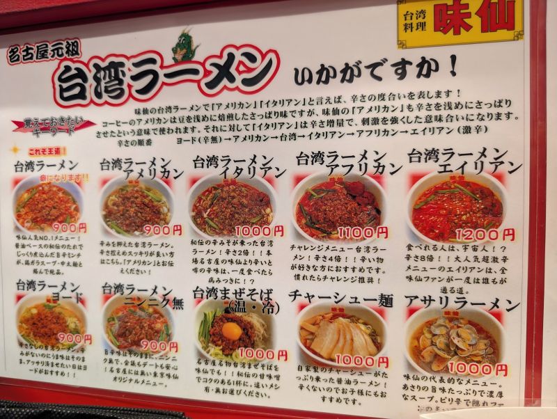 味仙は愛知県内に12店舗(名古屋市9+日進市1+豊田市1+中部国際空港内に1)、東京都内に3店舗(神田2+新橋1)、大阪府内に1店舗ある台湾料理の専門店。台湾ラーメンはこの店の代名詞とも言うべき名物メニューです。ムチャクチャ辛いんですが、これがなぜかクセになり、全国各地にまでファンの輪を広げています。