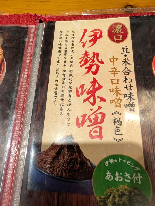 伊勢味噌は豆・米合わせ味噌。褐色の中辛口味噌、濃い口です。初めてスープを飲んだ時は、ちょっと苦みを感じました。大人の味噌?食べ進むと、徐々にマイルドに。「あおさ」の力かな。レンゲがとまらなくなります。