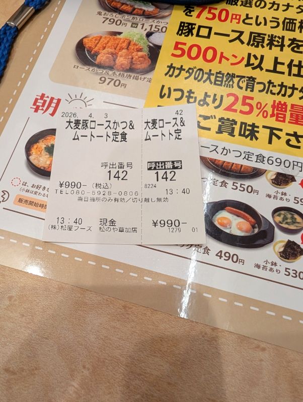 用事ができて、草加へ。松のやでランチとなりました。頼んだのは大麦豚ロースかつ&ムートート定食です。