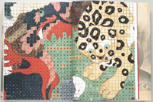 それだけでも十分個性的なのに、この絵はさらに升目(ますめ)描き、色彩分割という手法で描かれています。名前の通り小さな升目、それも一双当たり86、000個という膨大な数で描かれています。ひとつの升目は数センチ。デジタル画像のピクセルとは違い、単色ではなく中にもう一つの升目があるのものもあります。《 美の巨人たち 》ではこれは新印象派の画家たち(スーラやシニャック)が使用した色彩分割を既に江戸時代に編み出していたのではと解説してました。また、動物の輪郭に合わせて、曲線が描かれたりしています。やはりこの当たりは日本人の感性、ジャギー(ギザギザ)に我慢ができなかったのかも。