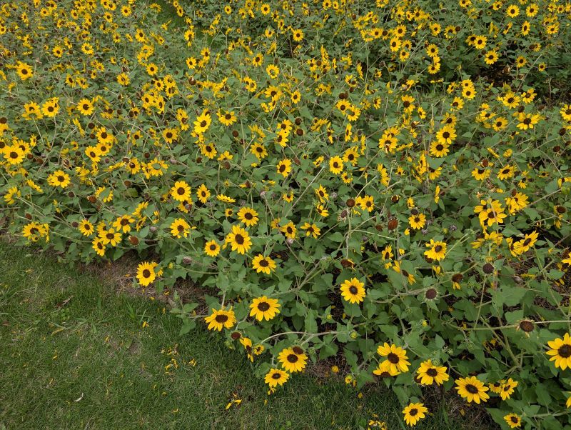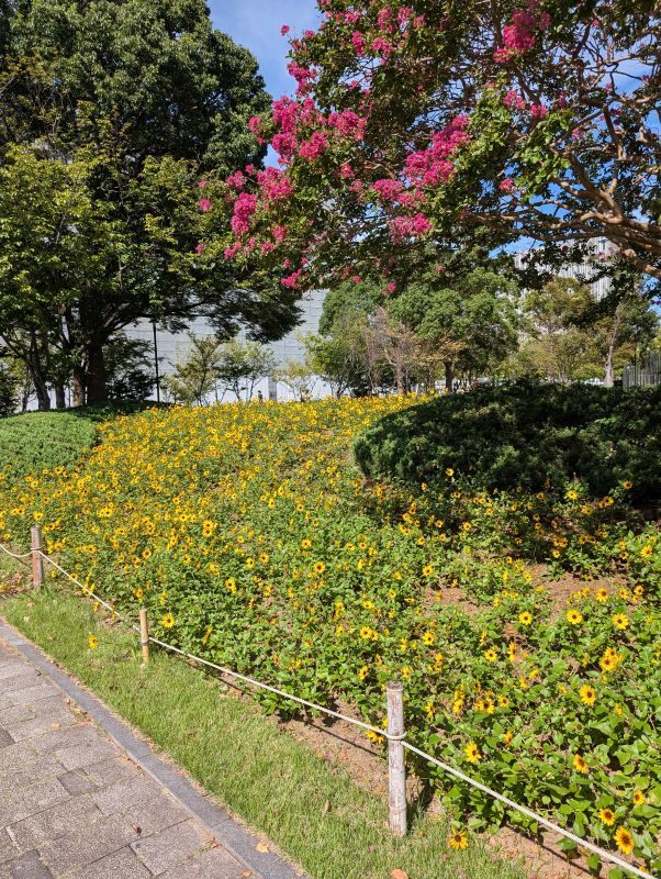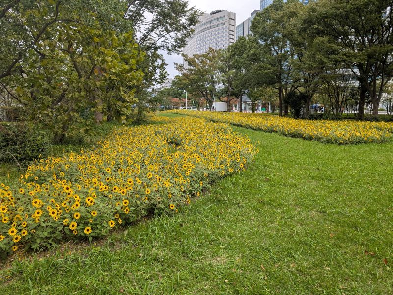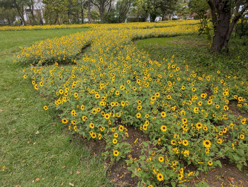 やっと暑さが和らぎました。昼休みの散策を再開。センタープロムナードに行って吃驚、公園がミニひまわりに埋め尽くされていました。